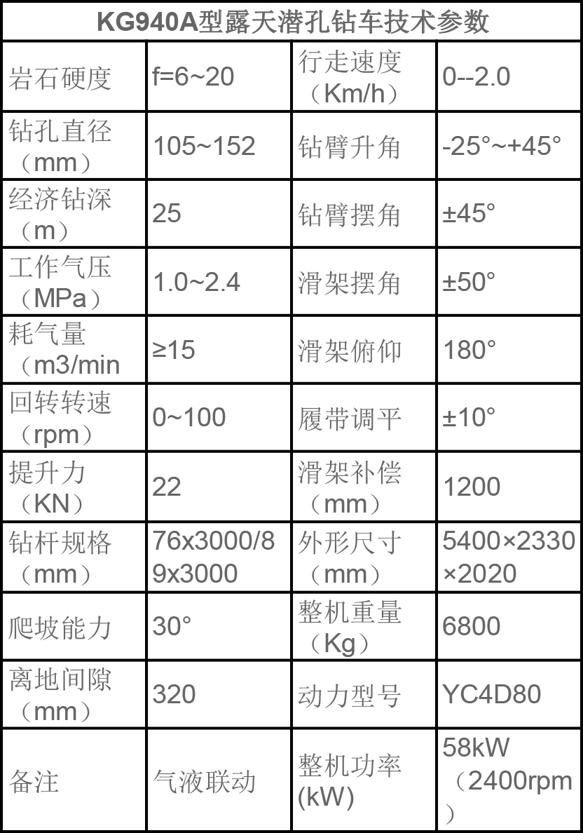 KG940A 型露天潛孔鉆車在KY140A 型履帶式露天潛孔鉆車的基礎(chǔ)上,對液壓系統(tǒng)、滑架部件、行走部件等進(jìn)行優(yōu)化升級,回轉(zhuǎn)轉(zhuǎn)速和推進(jìn)速度更快,可靠性更好。