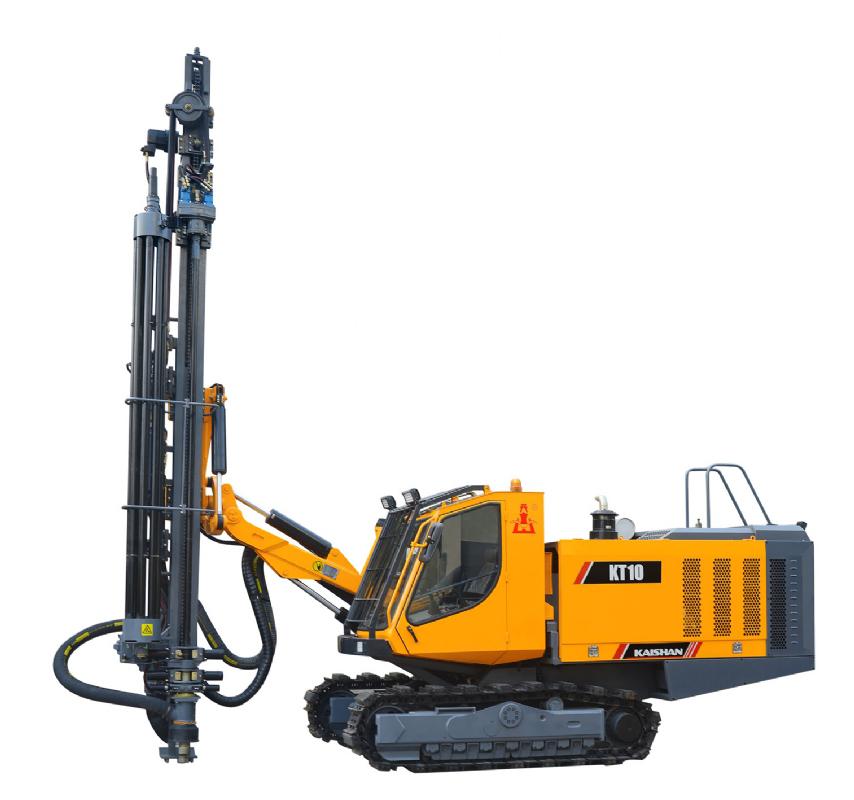 KT10型一體式潛孔鉆車以康明斯國三柴油機為單一動力,通過兩端輸出的方式同時帶動螺桿壓縮系統(tǒng)和液壓傳動系統(tǒng),可鉆鑿φ90-125mm垂直、傾斜和水平孔,主要用于露天礦山和石方工程鉆鑿爆破孔和預裂孔等。鉆車配有自動接卸桿系統(tǒng)和鉆桿潤滑模塊,可實現(xiàn)單人操作,減少礦山作業(yè)人員。鉆車主操縱動作集成在一個手柄上,操作簡單,配有防卡鉆系統(tǒng),并可選配鉆孔角度和深度指示,簡化了鉆孔過程控制并改善成孔質(zhì)量。高效的集塵系統(tǒng)、寬敞的駕駛室、大功率冷暖空調(diào)和優(yōu)良的音響設備提供了優(yōu)良的操作環(huán)境,大限度提高操作人員工作效率。