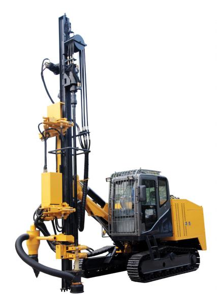 KY9S型露天潛孔鉆車的行走、推進(jìn)、回轉(zhuǎn)及角度調(diào)整等動(dòng)作均采用液壓驅(qū)動(dòng),動(dòng)力強(qiáng)勁;沖擊采用高風(fēng)壓氣動(dòng)沖擊,鑿巖效率高;配有液壓干式集塵器收集粉塵,減少對(duì)環(huán)境的污染。鉆車還配有直線式接缷桿系統(tǒng)、浮動(dòng)接頭和自動(dòng)噴油裝置(保護(hù)鉆桿螺紋)、空調(diào)駕駛室(提供舒適的工作環(huán)境)、自動(dòng)控制防卡釬系統(tǒng)(減少卡鉆機(jī)率)等模塊。鉆車具有自動(dòng)化程度高、節(jié)能高效、舒適環(huán)保、操作方便、行駛安全等特點(diǎn)。