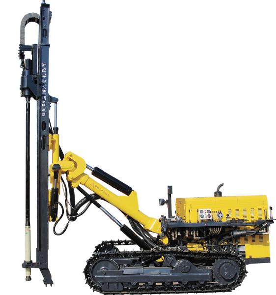 KG940A 型露天潛孔鉆車在KY140A 型履帶式露天潛孔鉆車的基礎上,對液壓系統(tǒng)、滑架部件、行走部件等進行優(yōu)化升級,回轉(zhuǎn)轉(zhuǎn)速和推進速度更快,可靠性更好。